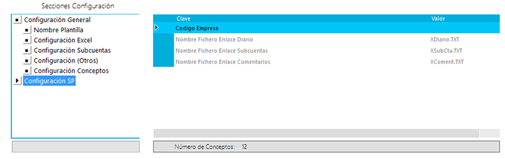 4. Secciones Configuración: en este apartado, debemos ir cumplimentando la Configuración Excel, las Subcuentas, los conceptos, etc. Nótese que pinchando en cualquiera de las opciones, se nos desplegará una tabla en la parte derecha donde podemos ver los valores actuales y desde donde podremos añadir/eliminar/modificar los mismos si pinchamos en el icono del lápiz situado a la derecha del selector de plantillas.